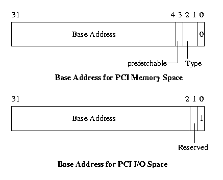 There are two basic types of Base Address Register, the first indicates within which address space the devices registers must reside; either PCI I/O or PCI Memory space. This is indicated by Bit 0 of the register. Figure 6.10 shows the two forms of the Base Address Register for PCI Memory and for PCI I/O.