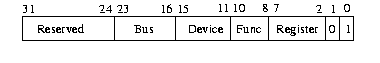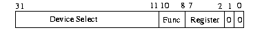 So that the CPU's PCI initialization code can address devices that are not on the main PCI bus, there has to be a mechanism that allows bridges to decide whether or not to pass Configuration cycles from their primary interface to their secondary interface. A cycle is just an address as it appears on the PCI bus. The PCI specification defines two formats for the PCI Configuration addresses; Type 0 and Type 1; these are shown in Figure 6.3 and Figure 6.4 respectively. Type 0 PCI Configuration cycles do not contain a bus number and these are interpretted by all devices as being for PCI configuration addresses on this PCI bus. Bits 31:11 of the Type 0 configuraration cycles are treated as the device select field. One way to design a system is to have each bit select a different device. In this case bit 11 would select the PCI device in slot 0, bit 12 would select the PCI device in slot 1 and so on. Another way is to write the device's slot number directly into bits 31:11. Which mechanism is used in a system depends on the system's PCI memory controller.