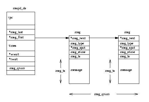 data structure contains an ipc_perm data structure and pointers to the messages entered onto this queue. In addition, Linux keeps queue modification times such as the last time that this queue was written to and so on. The msqid_ds also contains two wait queues; one for the writers to the queue and one for the readers of the message queue.