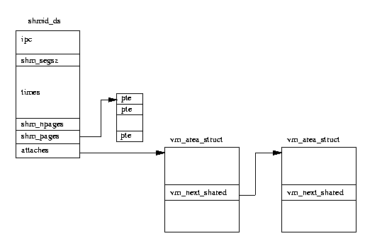 The first time that a process accesses one of the pages of the shared virtual memory, a page fault will occur. When Linux fixes up that page fault it finds the vm_area_struct data structure describing it. This contains pointers to handler routines for this type of shared virtual memory. The shared memory page fault handling code looks in the list of page table entries for this shmid_ds to see if one exists for this page of the shared virtual memory. If it does not exist, it will allocate a physical page and create a page table entry for it. As well as going into the current process's page tables, this entry is saved in the shmid_ds. This means that when the next process that attempts to access this memory gets a page fault, the shared memory fault handling code will use this newly created physical page for that process too. So, the first process that accesses a page of the shared memory causes it to be created and thereafter access by the other processes cause that page to be added into their virtual address spaces.
